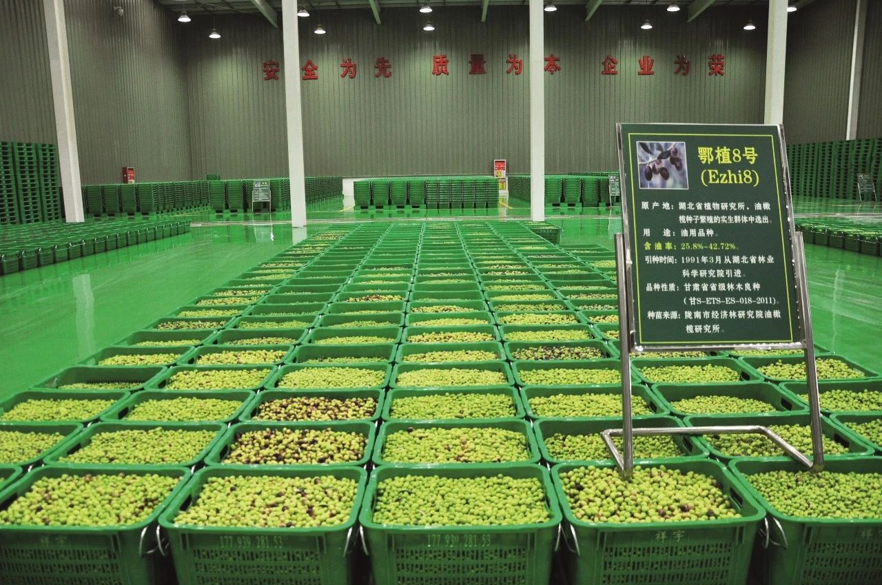 看著鄉(xiāng)親們因賣橄欖果發(fā)愁,劉元勇、李慧夫婦心急如焚。為讓油橄欖果發(fā)揮更大價值,他們在政府的支持下,于1997年引入一臺日榨鮮果20噸的橄欖油榨油設(shè)備,并在隴南市區(qū)西部的吉石壩成立了隴南第一家油橄欖果生產(chǎn)加工企業(yè)——隴南市祥宇油橄欖開發(fā)有限責任公司。當年,祥宇公司首次利用當?shù)厮a(chǎn)的油橄欖鮮果榨出了符合國際標準的食用橄欖油。這意味著當?shù)厝罕姺N植的橄欖樹不僅具有生態(tài)效益,也能實打?qū)嵉亟o果農(nóng)帶來經(jīng)濟收益。之后的若干年間,因種植油橄欖帶來的豐厚收益,當?shù)剞r(nóng)民種植熱情越來越高漲,油橄欖種植面積逐年擴大,鮮果產(chǎn)量迅速增加。